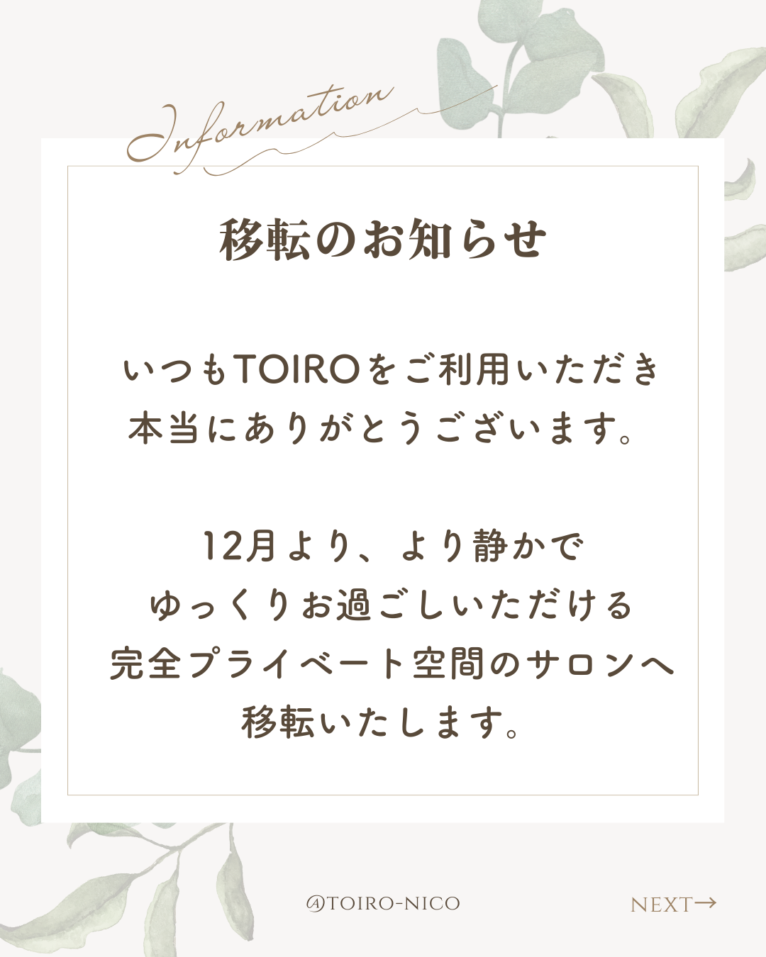 12月よりより静かでゆっくりお過ごしいただける完全プライベート空間のサロンへ移転いたします。