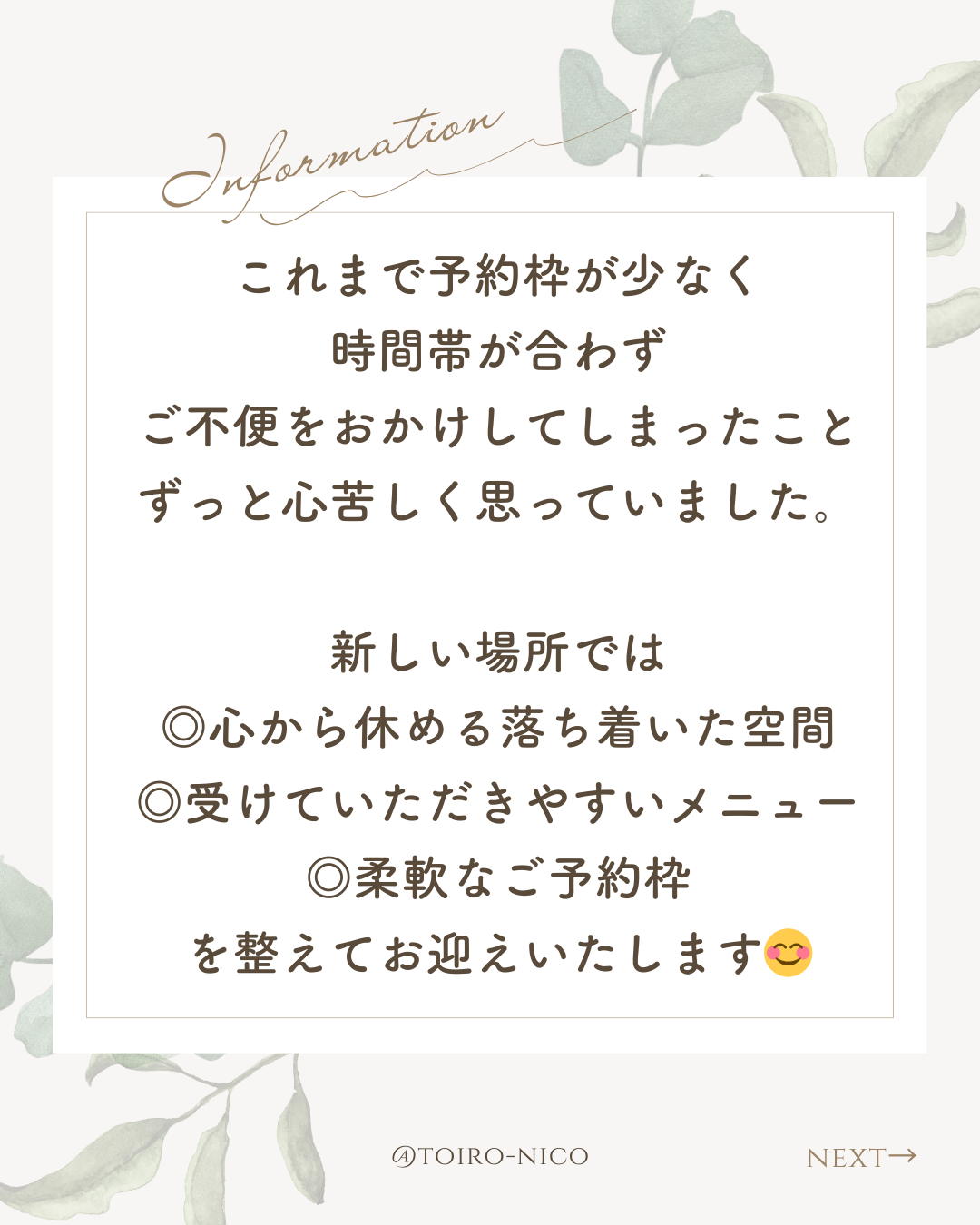新しい場所では◎心から休める落ち着いた空間◎受けていただきやすいメニュー◎柔軟なご予約枠を整えてお迎えいたします。